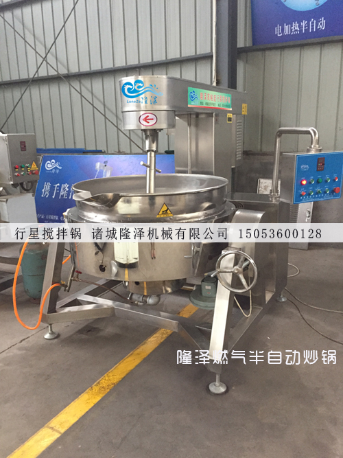本機主要由底座、燃具、鍋(guō)體和傾鍋裝置、自動攪拌裝置組成。以液化氣(qì)(天然氣)為熱源。打(dǎ)開點火閥,點燃(rán)燃燒器,人工(gōng)加入食用油,待油溫達到烹飪溫度時,加入適量的物料;人工傾鍋、攪 拌,使物料(liào)在國內均勻,待物(wù)料加工完畢後,關(guān)汽熄火,轉動(dòng)輪手(shǒu),通過蝸輪、蝸杆傳動裝置使鍋體旋轉傾斜,將菜倒入一容器內。